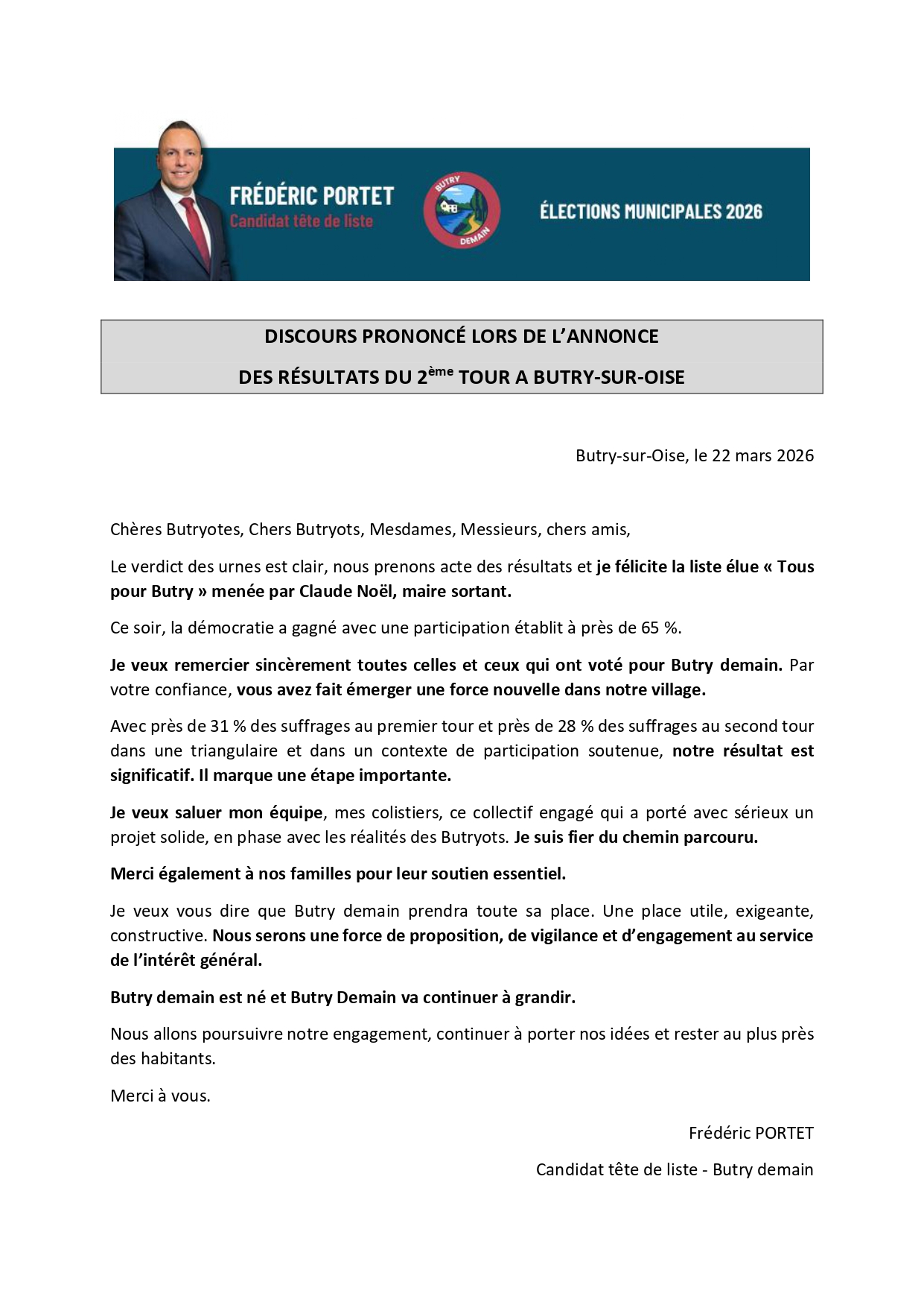 Le second tour des élections municipales à Butry-sur-Oise a rendu son verdict. Butry demain n’emportera pas cette fois la mairie. Notre liste recueille 308 voix et obtient 2 sièges au conseil municipal dans un scrutin remporté par la liste de Claude Noël avec 417 voix, devant Daniel Desfoux avec 385 voix.